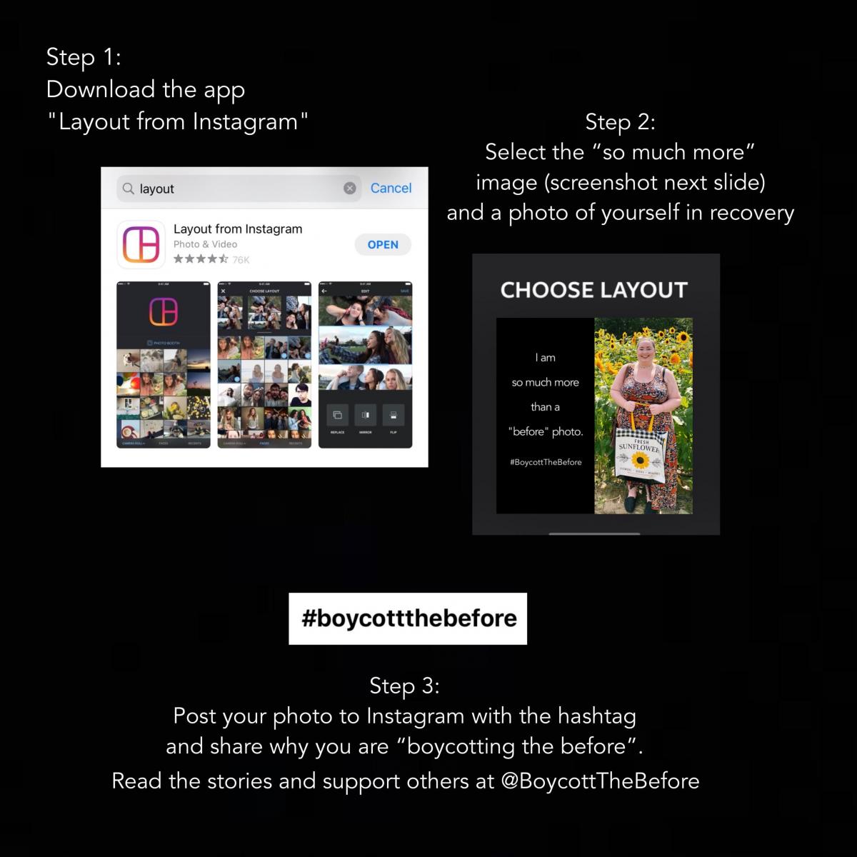 Anyone in recovery can participate in the #BoycottTheBefore campaign on social media by sharing the black and white “I am so much more than a “before” photo” image next to an image of them in recovery. The stories are shared on Instagram on @boycottthebefore.