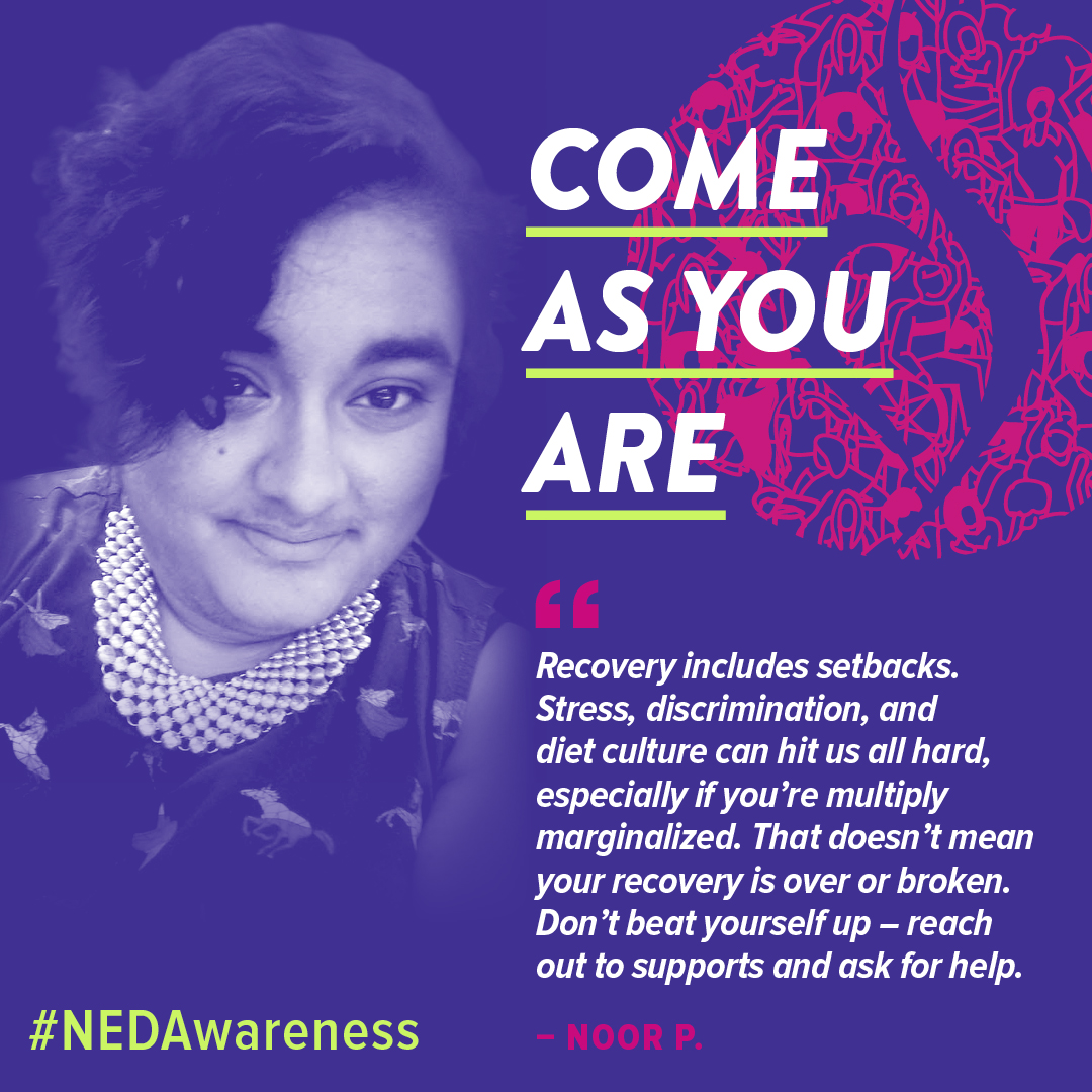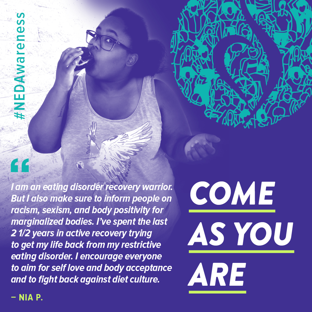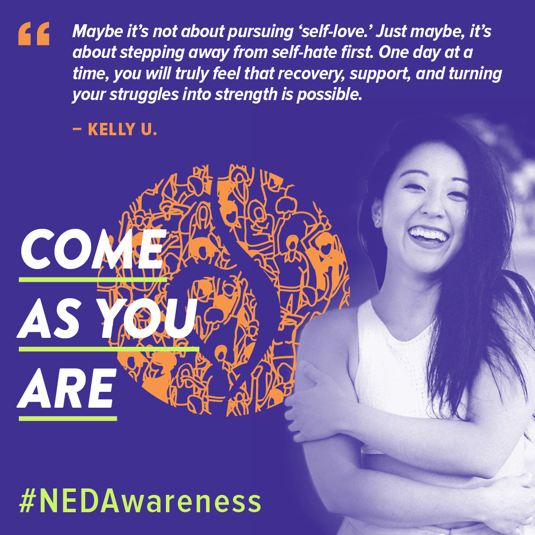 As National Eating Disorders Awareness Week (NEDAwareness Week) comes to a close, I reflect on how the 2019 theme, Come as You Are, highlights NEDA’s movement towards inclusivity in the greater eating disorders (ED) community, and the goal of unifying the ED field. In particular, Come as You Are sends a message to individuals at all stages of body acceptance and ED recovery that their stories are valid. We hope that message continues beyond this week.