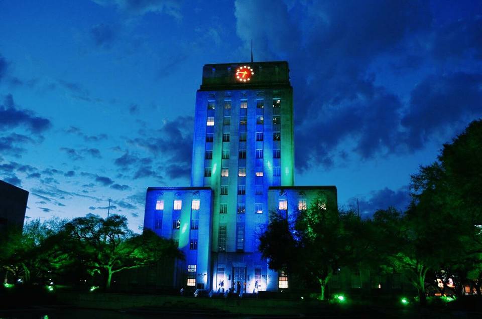 Priya James: "Eating disorders are still, unfortunately, illnesses that are not really talked about or understood. As one of the co-chairs of the Houston NEDA Walk and someone who has been directly affected by an eating disorder, I feel an overwhelming sense of pride standing in front of such prominent city buildings being lit up in NEDA colors. Each year the lighting makes me feel like all the hard work that myself and others in the city do for awareness is really making a difference." [Photo by Piper Gourley]
