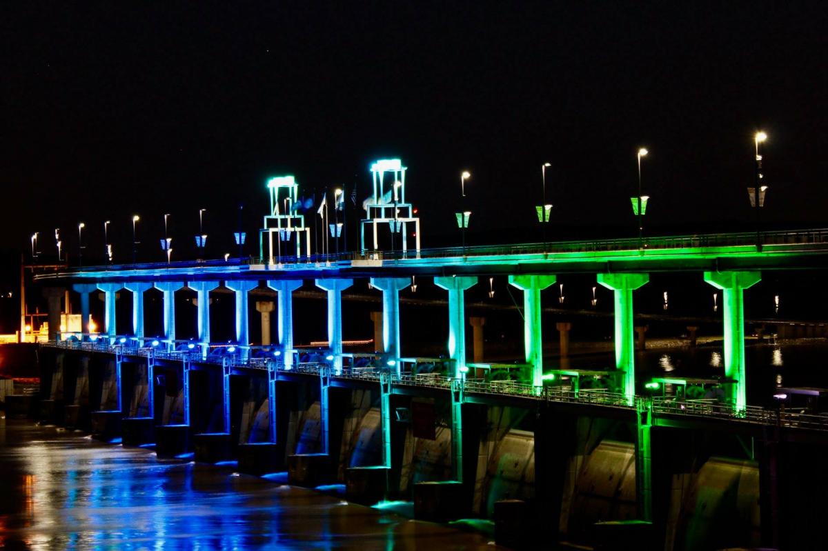 Jillian Tofukuji: “When I heard that Arkansas would be participating in the NEDAwareness lighting this year, I was overjoyed. I saw the Big Dam Bridge illuminated in blue and green from the freeway driving in, and felt an instantaneous sense of solidarity. As someone who lives with an eating disorder, I see the importance of shedding light on this topic and was proud to see Arkansas lending visibility to eating disorder awareness.” [Photo by Kelsey Bell]