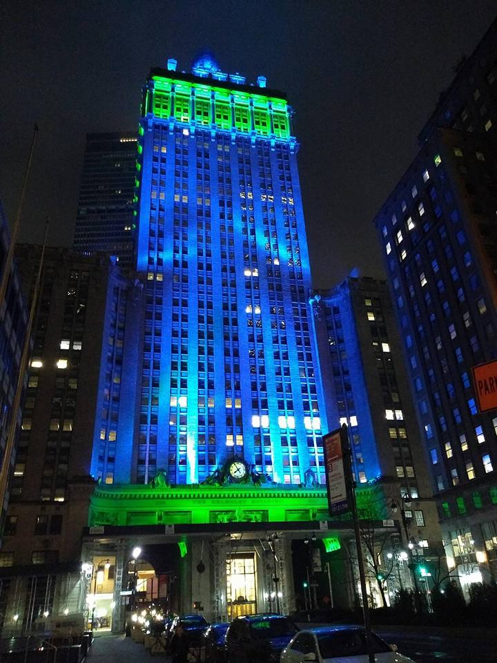 TJ Owens: "The Helmsley Building was magnificent draped in blue and green to symbolize eating disorder awareness and standing in its radiant glow, I was reminded of my struggles and how I overcame my eating disorder. I felt a solidarity with all the other people who are fighting to recover, are in recovery and - I felt like I wanted to invoke the strength of this towering building to continue with my recovery. It was one of the proudest moments I ever had. Thank you NEDA thank you Helmsley Building!" [Photo by Mariana]