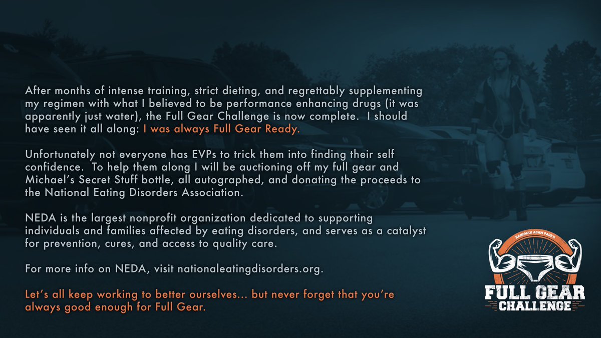 Professional wrestling offers a unique combination of athleticism and the art of storytelling. Through the use of larger-than-life characters and sometimes relatable storylines, the audience is met with events they can connect with. For months, professional wrestler Adam Page has offered a storyline of his journey through pressures of looking perfect for a big matchup. His friends make comments that he needs to be “full gear ready” (skinnier and bulkier) for this match. With a mix of these comments and comparing his body to his opponents, he struggles with his body image, and this takes over his life. We see that he becomes obsessed with training and how he eats. Eventually, he does accept his body and regains self confidence. At the end of this storyline, he tweeted out that he recognizes that the journey to self confidence may not be as easy for those struggling and has decided to auction off his ring gear donating proceeds to benefit NEDA.