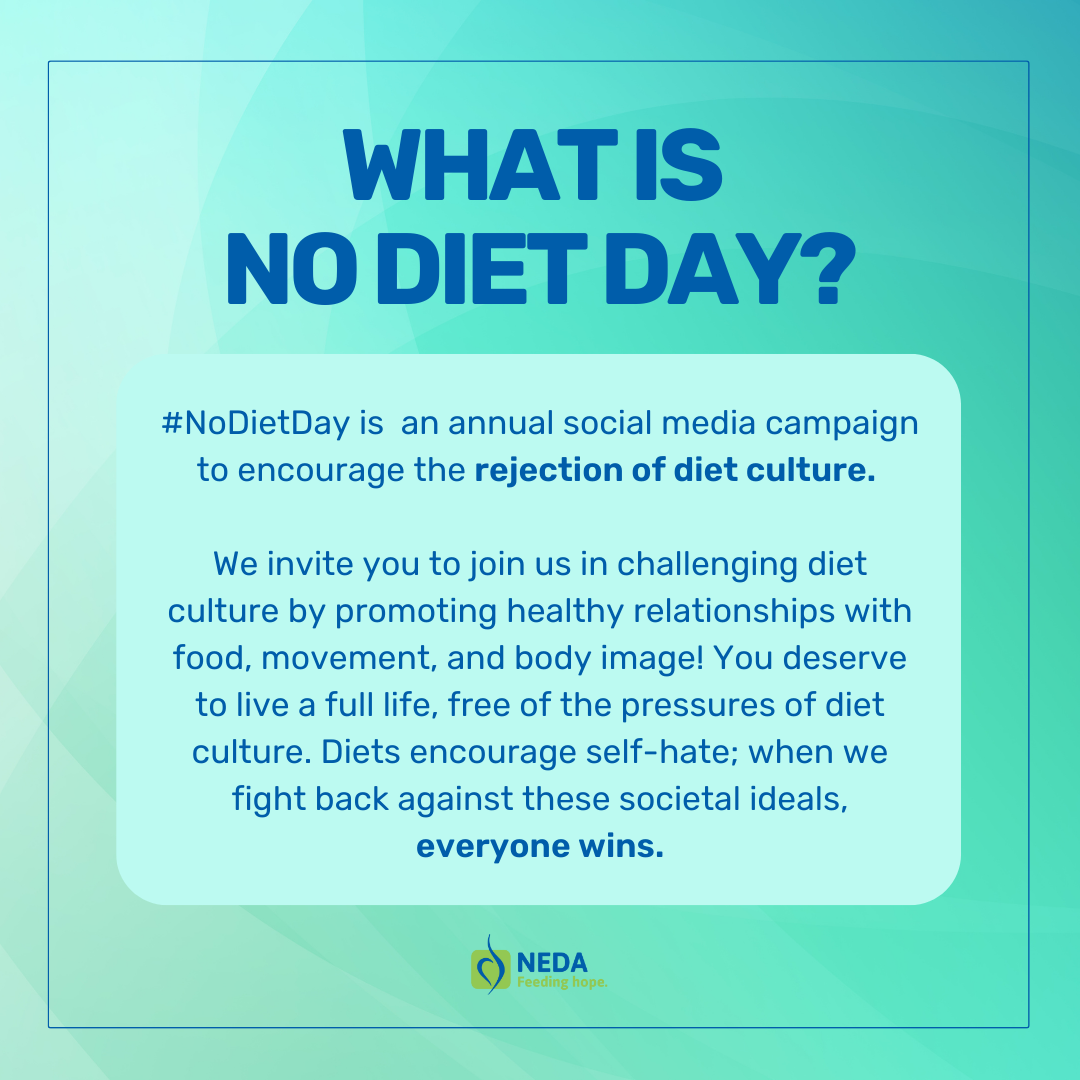 May 6th is #NoDietDay, an annual social media campaign to encourage the rejection of diet culture. This movement, started by Mary Evans Young in 1992, celebrates the importance of body acceptance, diversity, and respect for all body shapes and sizes.